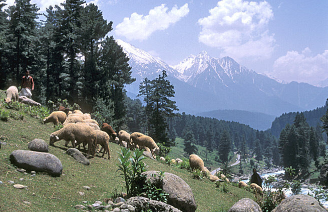Pahalgam is surrounded by high peaks, the Lidder and Seshnag Rivers tumble down picturesque deep-cut mountain valleys covered with giant conifers.