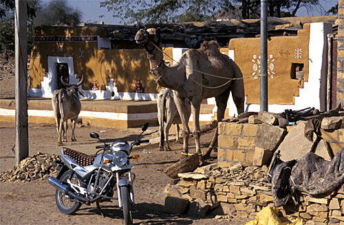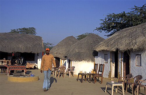 There are a couple of smallish resorts on the approach into the village, and the village itself has a couple of low - key gusethouse where you can stay in tranquility in traditional - style huts with clay-dung-walls and thatched roof and venture out on interesting camel trips inthe relatively remote and empty surrounding area