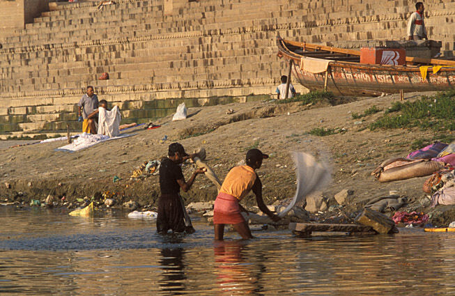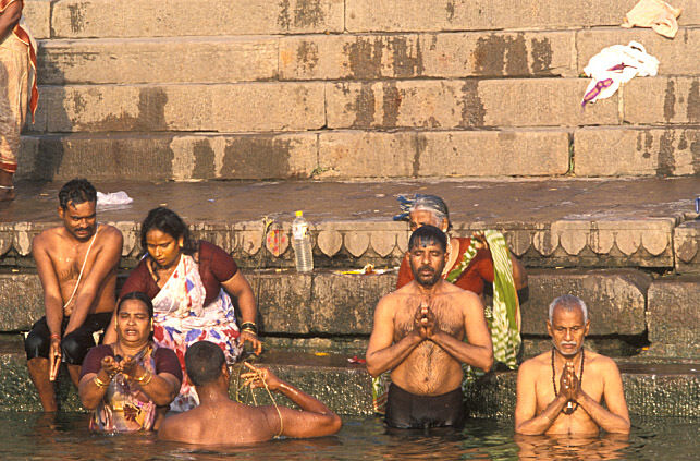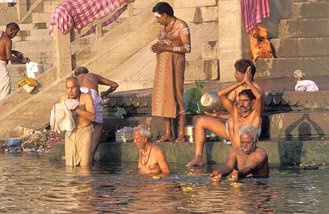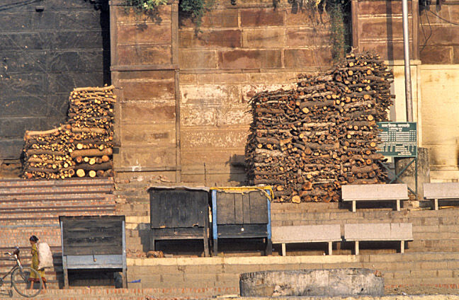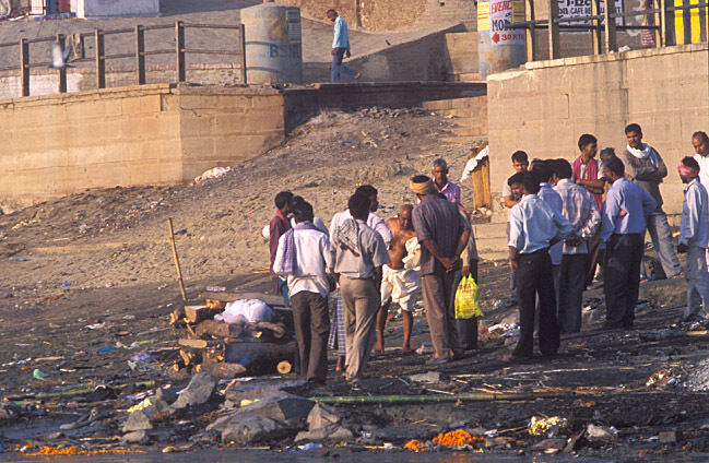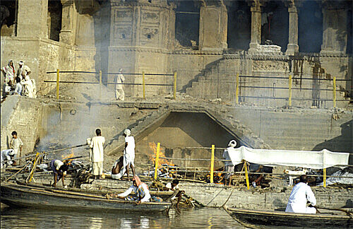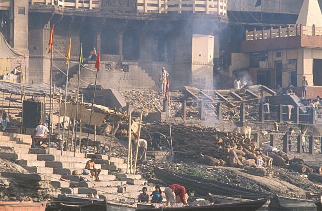 Pilgrimscome here to bathe in the river Ganges to wash away a lifetime of sins or to creamate their loved ones.