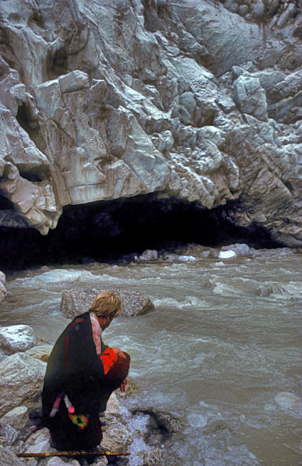 The water flows out of Gangotri Glacier beneath the soaring west face of Baghirathi Parvat (6856m) with the peak of Shivling(6543) towering the to the south.