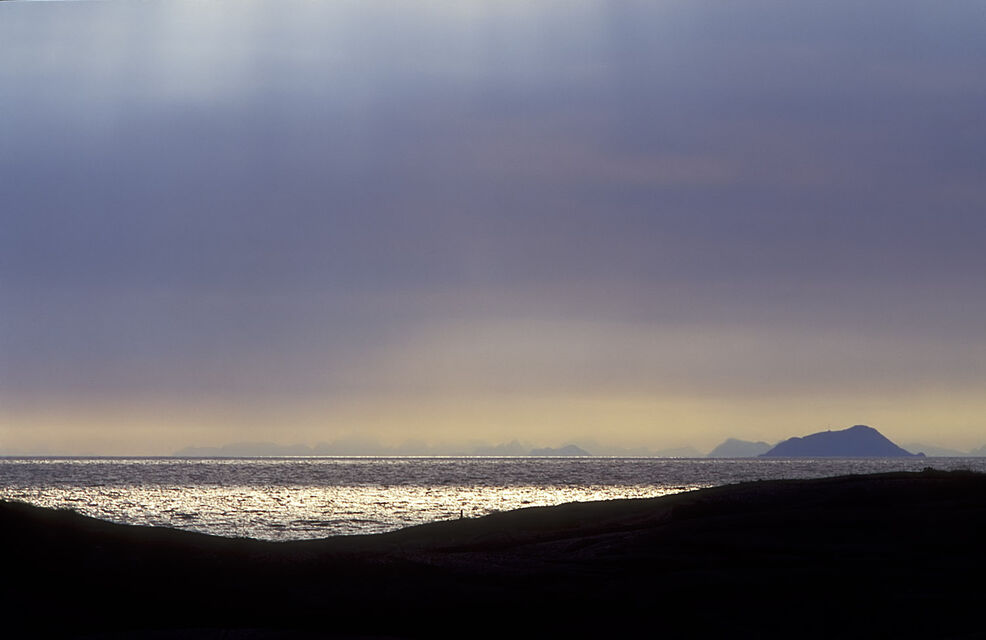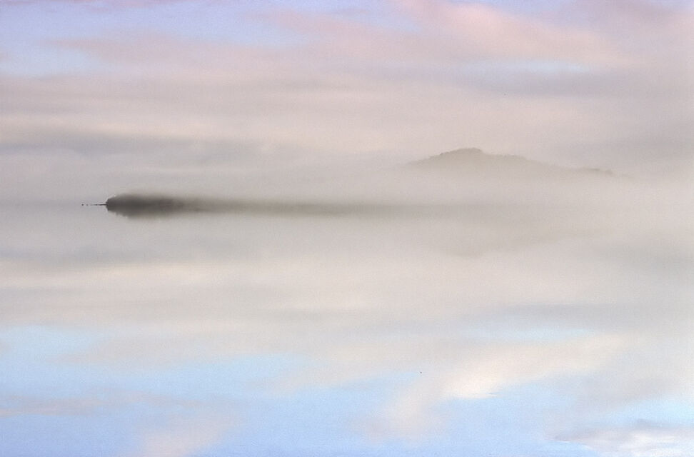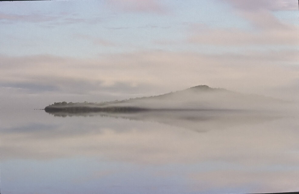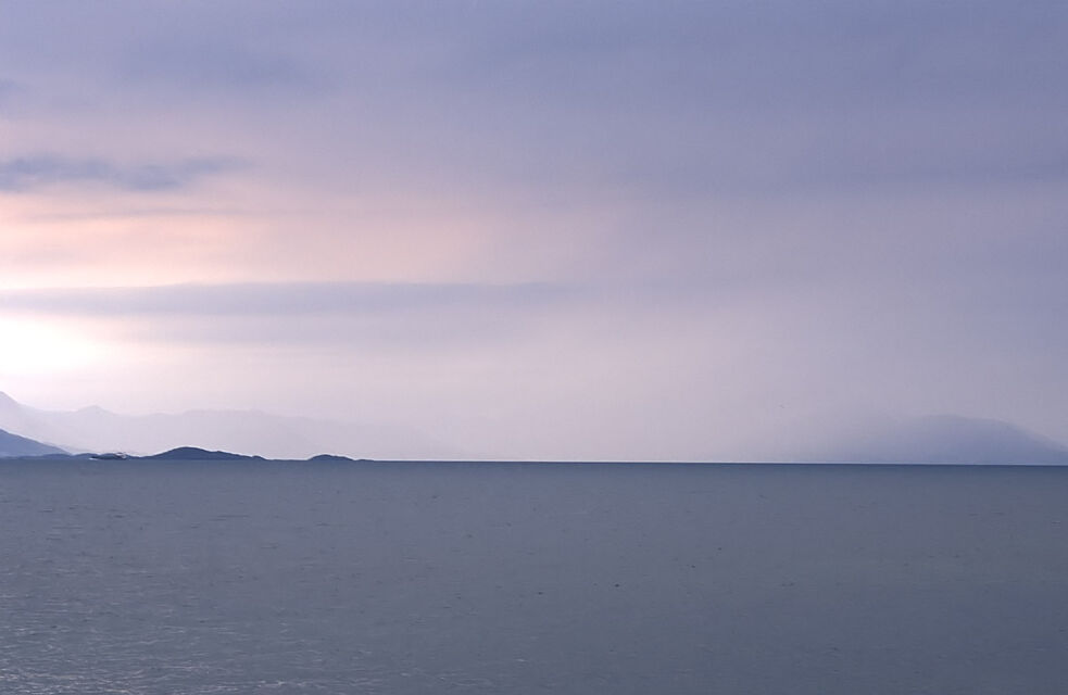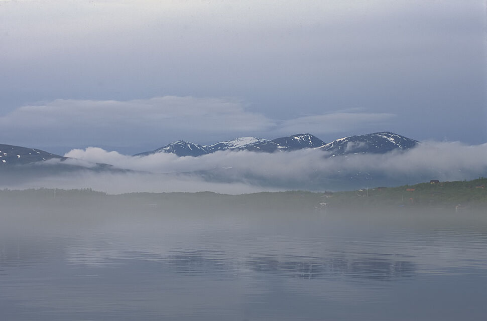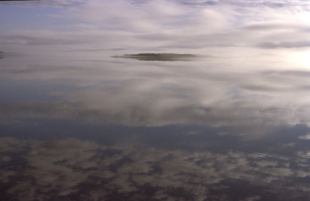 Det mjuka, det molniga, det svaga ljuset över en sjö stort som ett hav. Öar som i himlen och svaga, svaga konturer av fjällen.