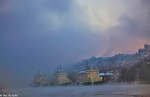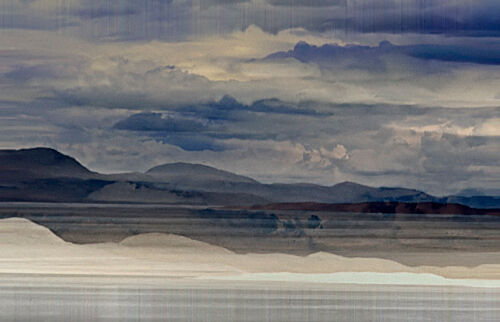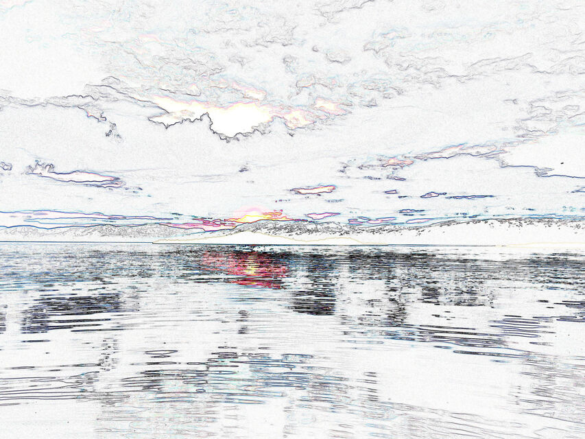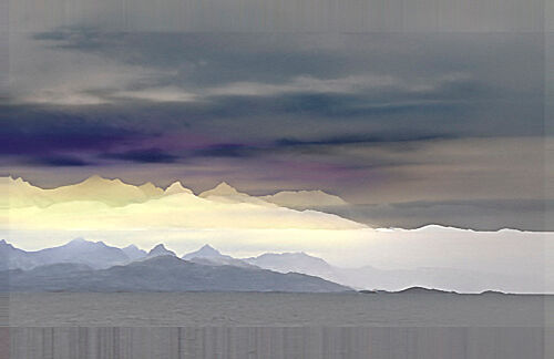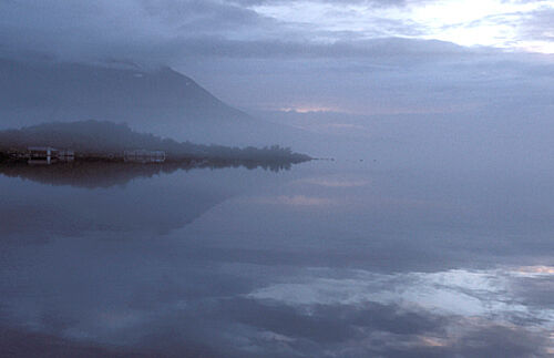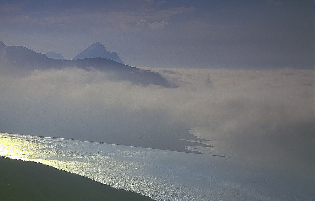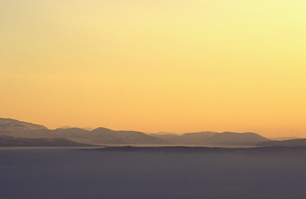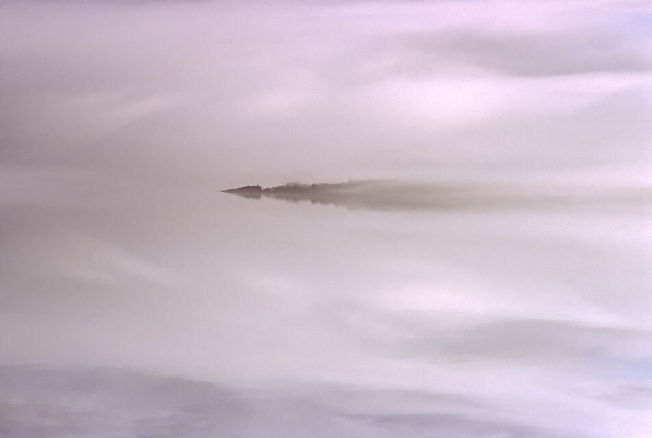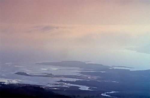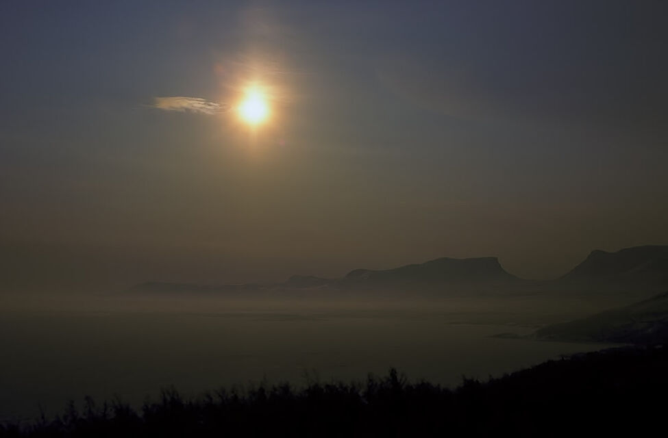 Det mjuka, det molniga, det svaga ljuset över en sjö stort som ett hav. Öar som i himlen och svaga, svaga konturer av fjällen.
